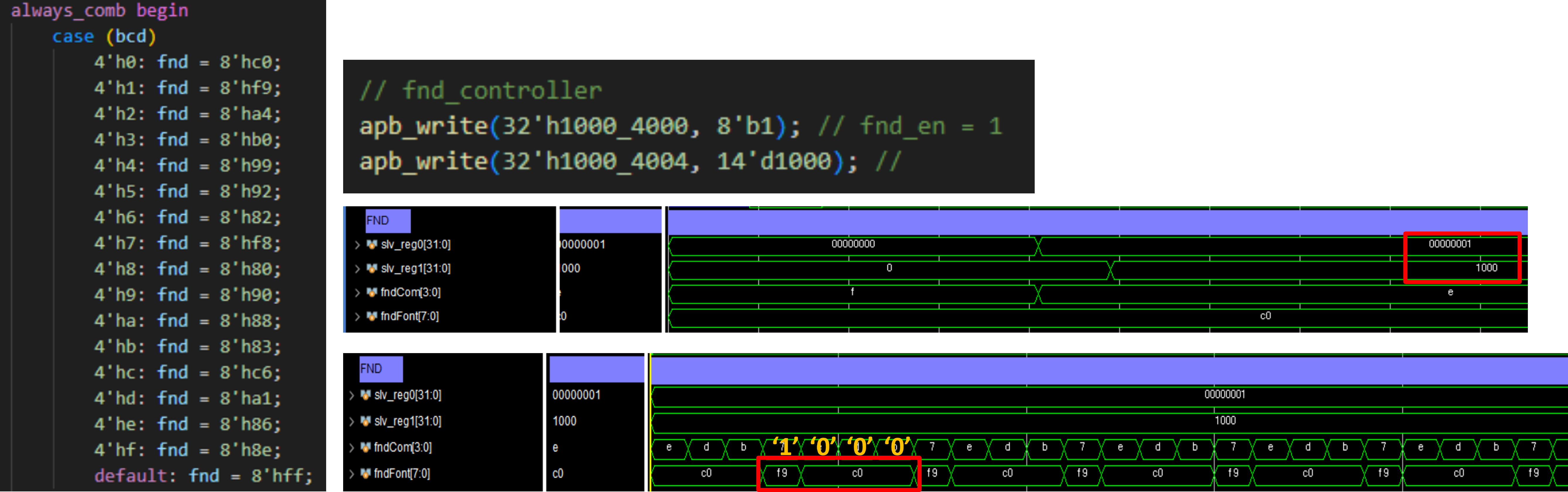 - en = 1로 설정, fnd_data = 14'd1000로 설정
