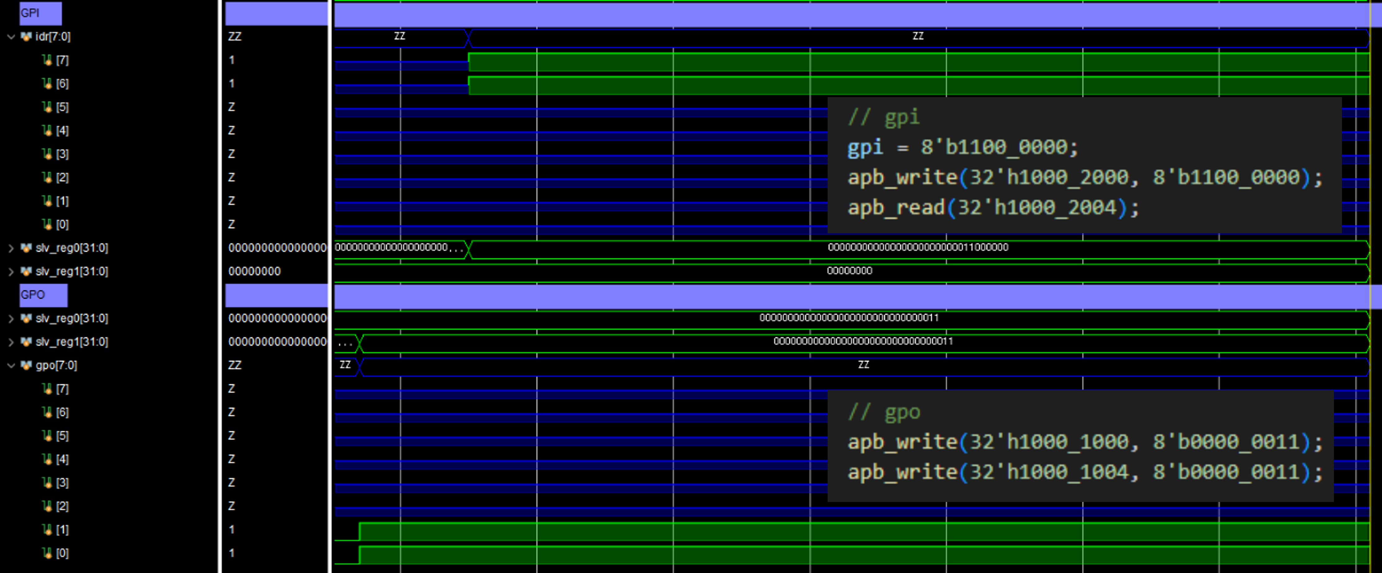 - GPI test : 입력 벡터 gpi = 8'b1100_0000을 넣고, CR[7:6] = 1로 입력 활성화. h1000_2004의 idr값을 읽음