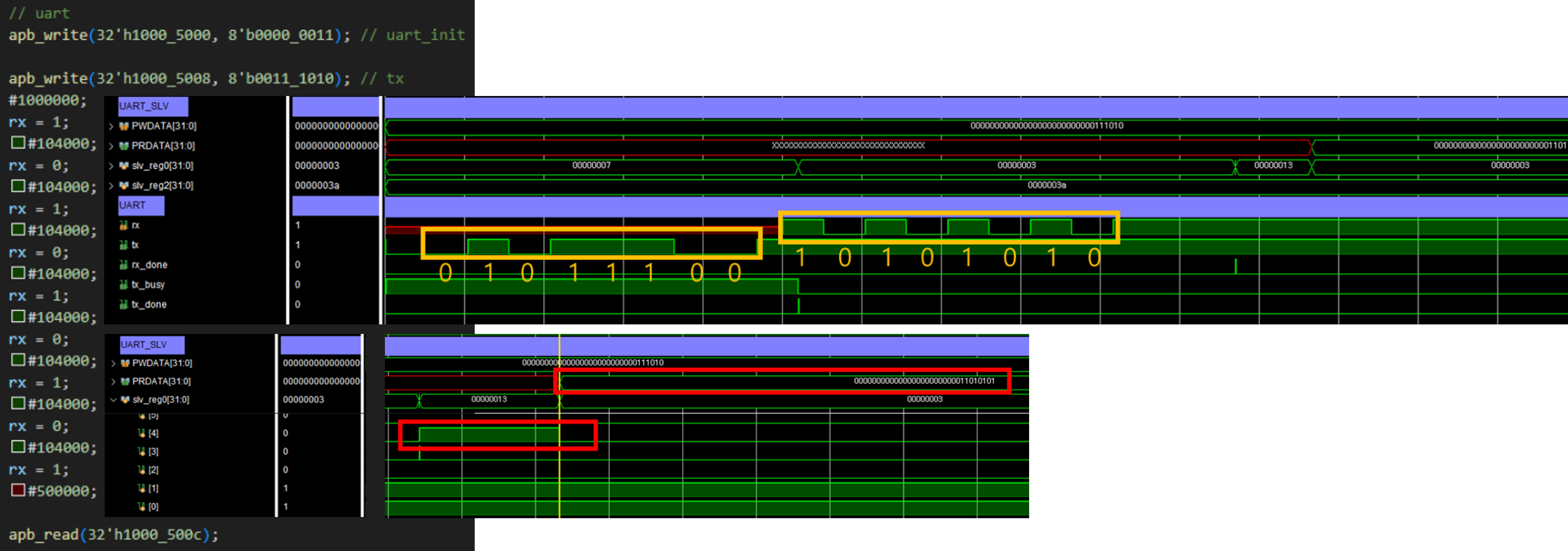 - rx에 1 0 1 0 1 0 1 0을 104us의 주기로 강제로 넣어주고 rx_data [7:0] 값 확인