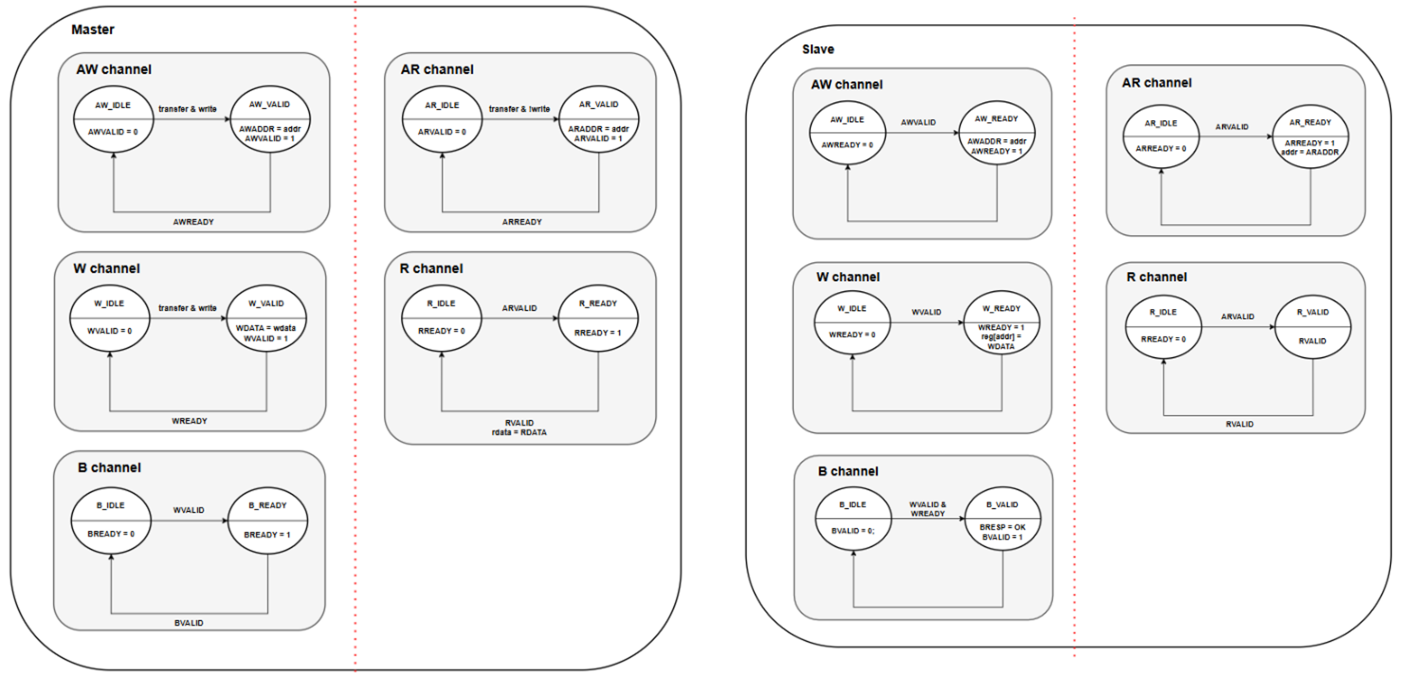 - AW, W, B, AR, R은 채널의 개념. 각 채널은 단방향이고 분리. 즉, 이론상 같은 시간에 read, write 가능