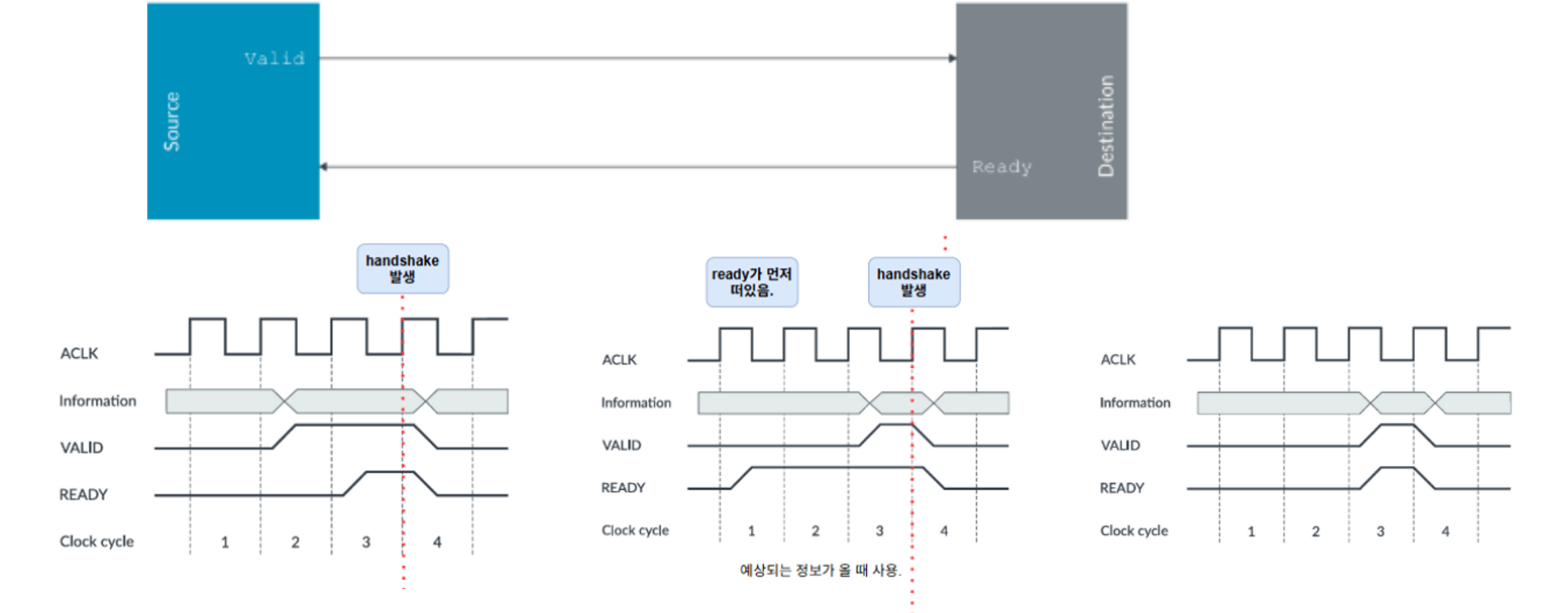 - Destination 쪽에서 잘 받았으면, Source 쪽으로 Ready 신호를 High로 전송