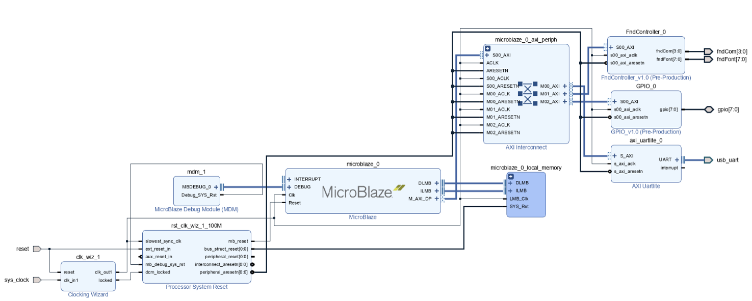 - MicroBlaze는 200MHz clk을 사용하므로 이를 clock wizard를 통해 clk을 100MHz로 바꿔줌