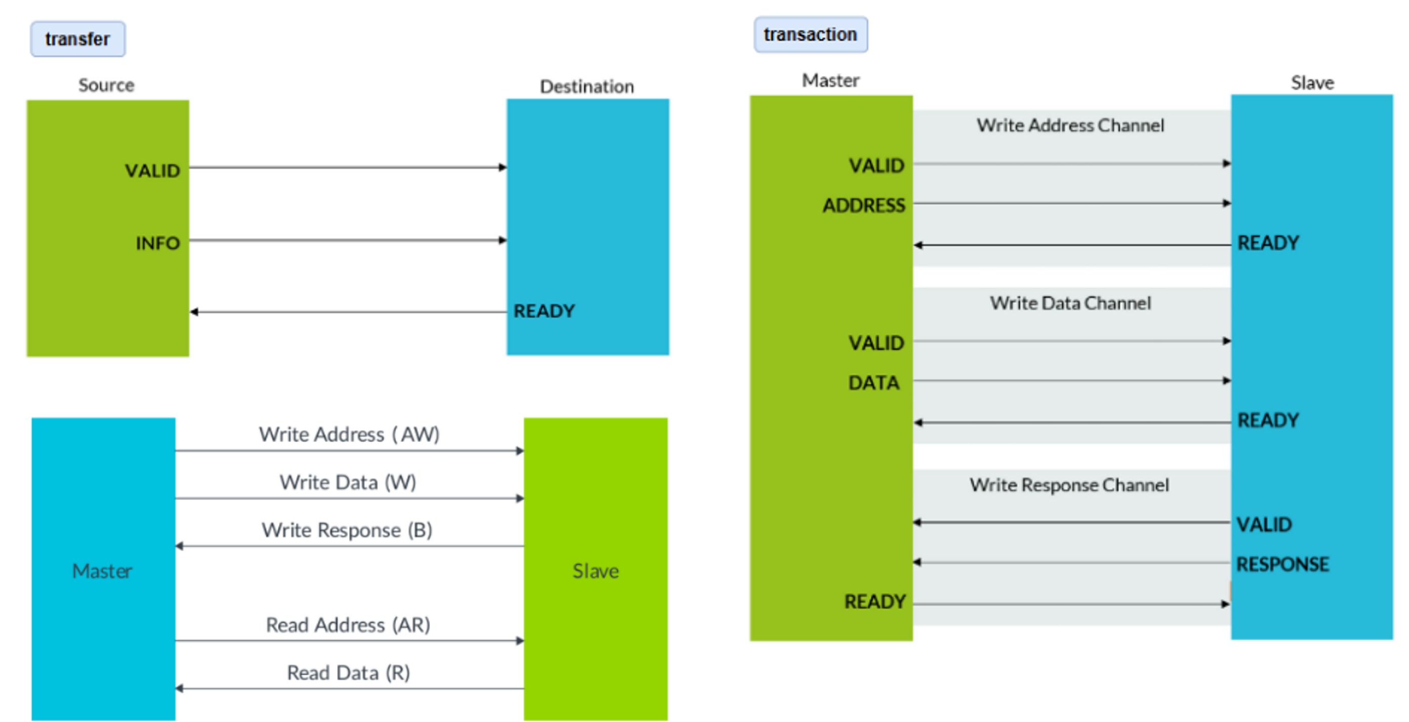 - 모든 채널에 VALID, READY handshake가 존재