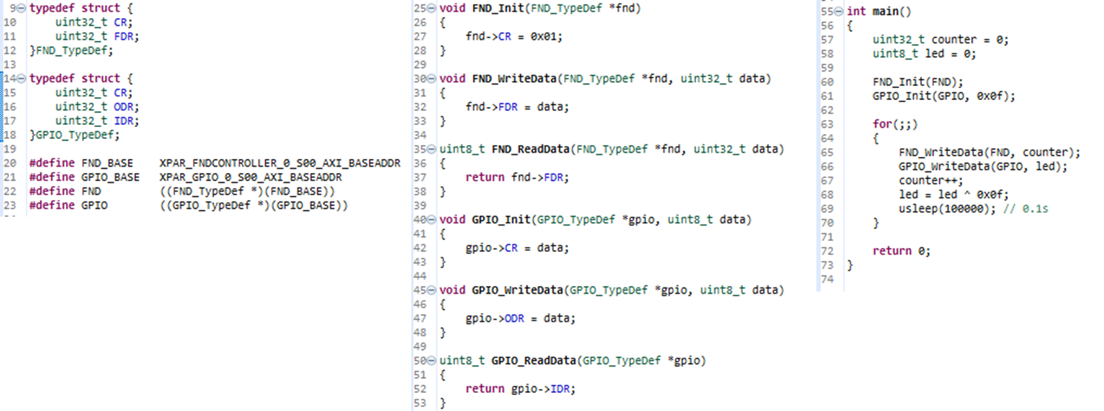 - AXI4-Lite의 GPIO, FND Peripheral test를 위해 간단한 C code 작성