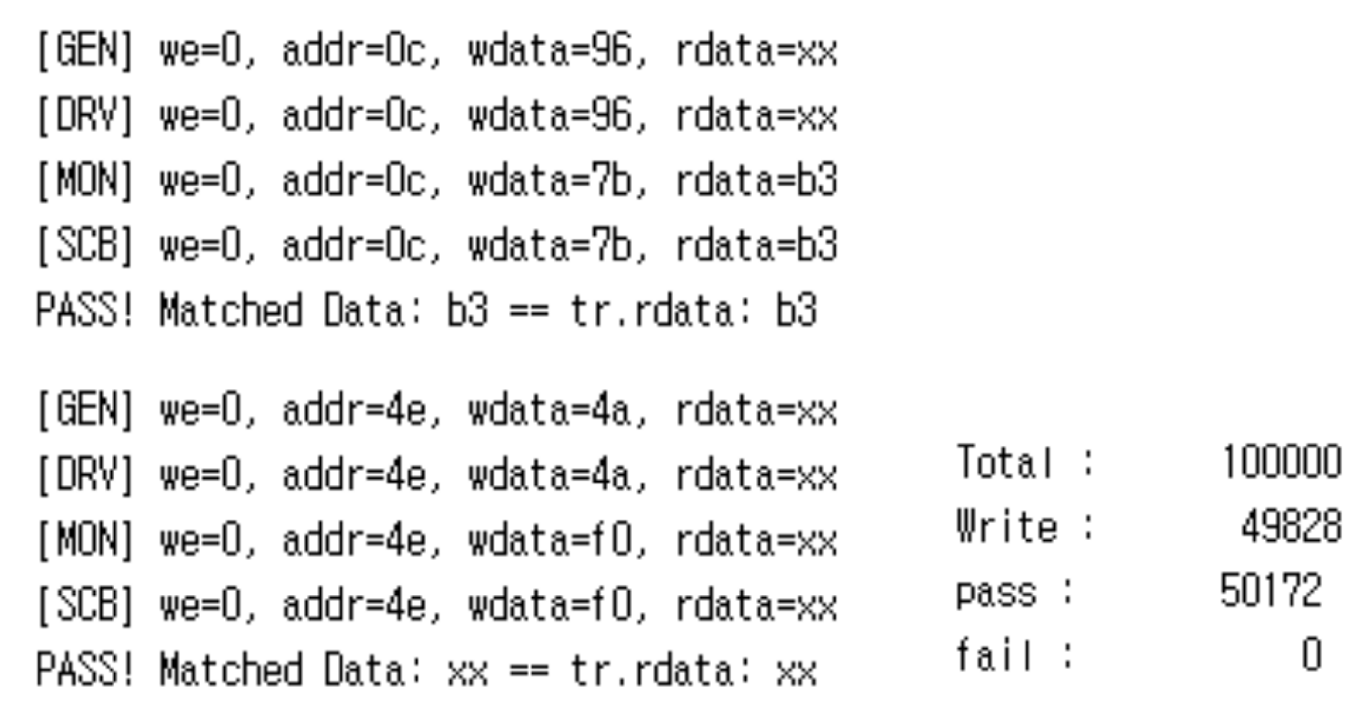- 총 100000회 동작 수행. write 동작 : 49828회, read & 비교 동작 : 50172회