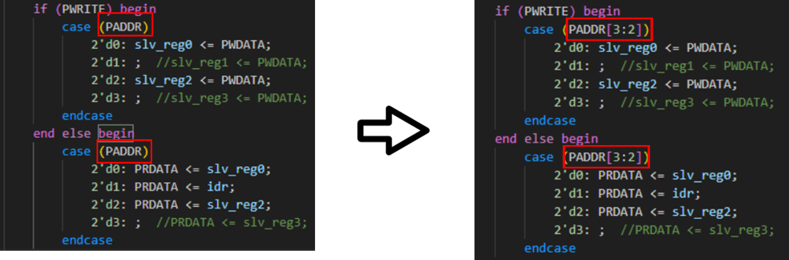 PADDR[3:2]로 수정 하여 4 Byte 단위 레지스터에 정확히 매핑되도록 함