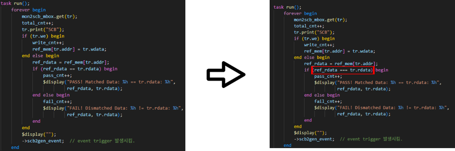 - 원인 분석 : == 연산자는 x (unknown), z (high-impedance) 값을 동등 비교하지 못함. 즉, x == x라도 FALSE가 되어 FAIL 발생